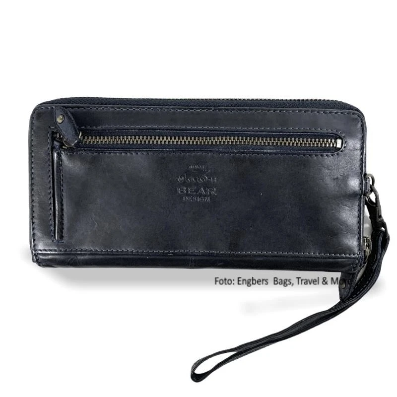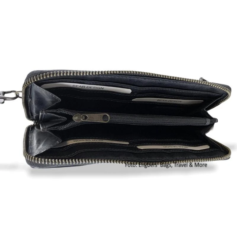 De Portemonnee Clutch Rits Rondom Sofie van Bear Design uit de Cow Lavato serie is een damesportemonnee met veel opbergmogelijkheden die ook middels het (afneembare) polsbandje te gebruiken is als clutch. De portemonnee is vervaardigd is van prachtig vintage gelooid rundleer. De binnenzijde biedt opbergmogelijkheden voor totaal 8 pasje en voor het opbergen van briefgeld. De achterzijde van deze functionele beurs heeft een ritsvak met souffle voor muntgeld.Â