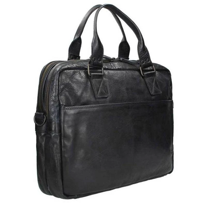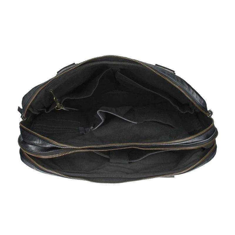 De achterzijde van de tas heeft een insteekvak en een ritsvak. Aan de voorzijde zit nog een ritsvak. Deze businesstas is voorzien van twee leren handvatten en heeft een afneembare lange leren schouderband om de tas over de schouder te dragen.