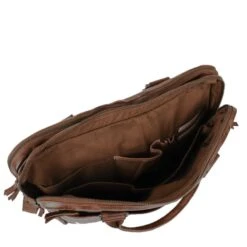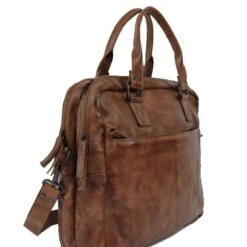 De achterzijde van de tas heeft een insteekvak en een ritsvak. Aan de voorzijde zit nog een ritsvak. Deze businesstas is voorzien van twee leren handvatten en heeft een afneembare lange leren schouderband om de tas over de schouder te dragen.