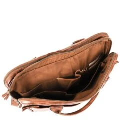De achterzijde van de tas heeft een insteekvak en een ritsvak. Aan de voorzijde zit nog een ritsvak. Deze businesstas is voorzien van twee leren handvatten en heeft een afneembare lange leren schouderband om de tas over de schouder te dragen.