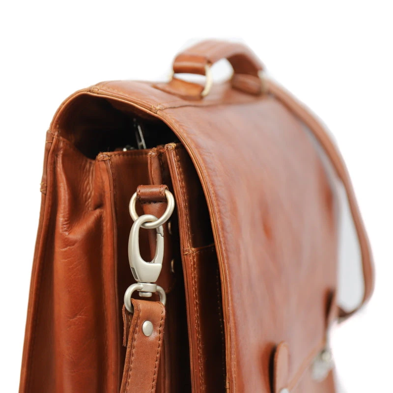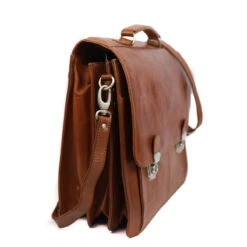 De binnenzijde van laptoptas “Jan Willem” bestaat uit drie ruime hoofdvakken vakken die worden gescheiden door middel van twee brede ritsvakken. Het gewatteerde laptopvak bevindt zich in het achterste vak en is geschikt voor een 15,6″ laptop. De drie hoofdvakken zijn geschikt om A4- documenten in op te bergen. In het voorste hoofdvak bevindt zich een organizer  met een telefoonvakje, pennenhouders en vakken voor passen. De gehele tas is gestoffeerd en afgewerkt met leren details. De tas sluit door middel van een flap met twee gespsluitingen, onder de flap zitten twee extra vakken één met rits en één zonder. Op het achterpand zit ook nog een extra ritsvak, meer dan genoeg opbergruimte dus. De tas heeft één stevig handvat en een afneembare verstelbare schouderband waarmee de tas gemakkelijk crossbody of op een schouder te dragen is.Â