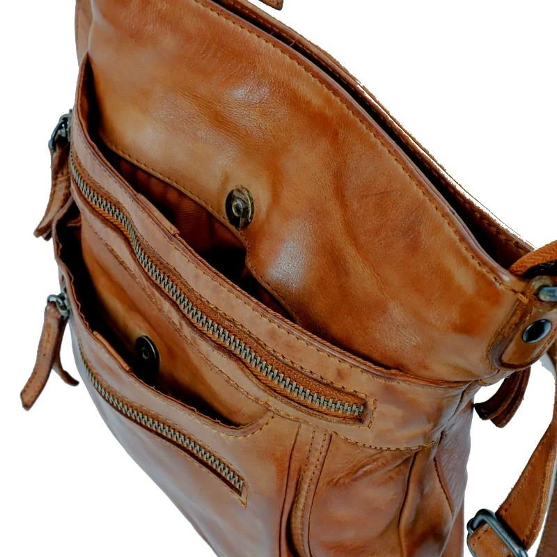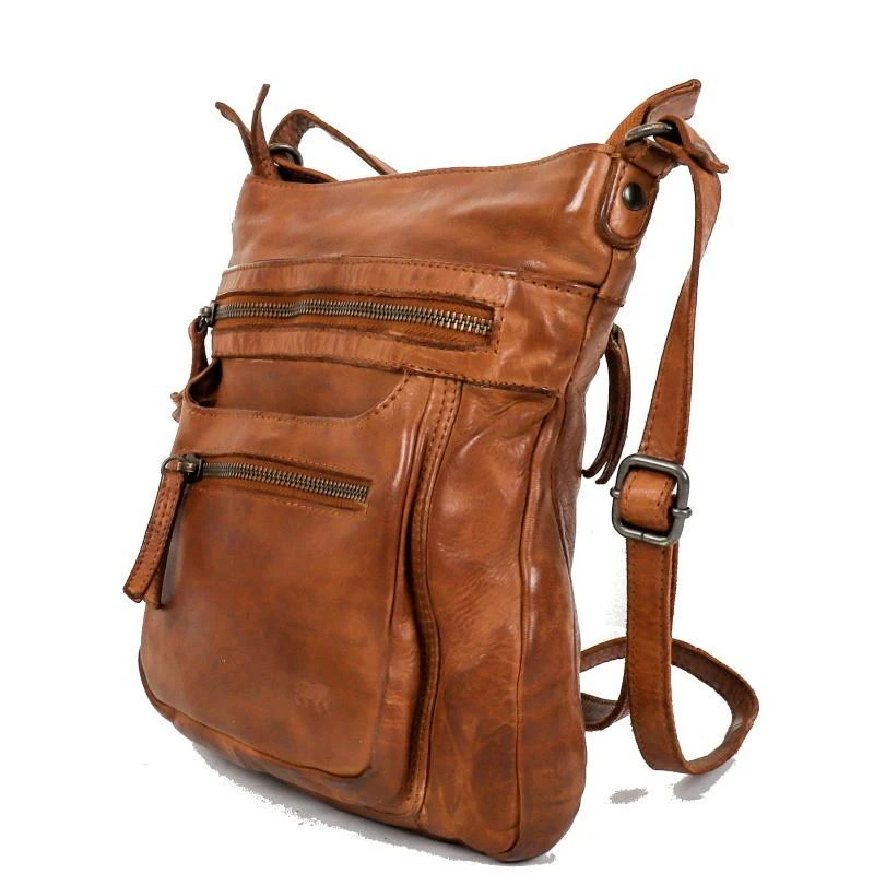 De Marion is een stoere schoudertas met veel ritsen en vakken uit de Cow Lavato serie van Bear Design en heeft een ruim hoofdvak dat kan worden afgesloten met een metalen rits. De tas heeft aan de voorzijde twee ritsvakken en twee insteekvakken. Aan de achterzijde bevindt zich nog een ritsvak. Aan de binnenzijde bevinden zich nog een insteekvak voor bv je telefoon en een ritsvak om bv je portemonnee veilig in op te bergen. Deze tas heeft een lange in lengte verstelbare schoudrband om crossbody of over een schouder te dragen. De tas is gemaakt van heel stevig en soepel gelooid Italiaans rundleer.Â