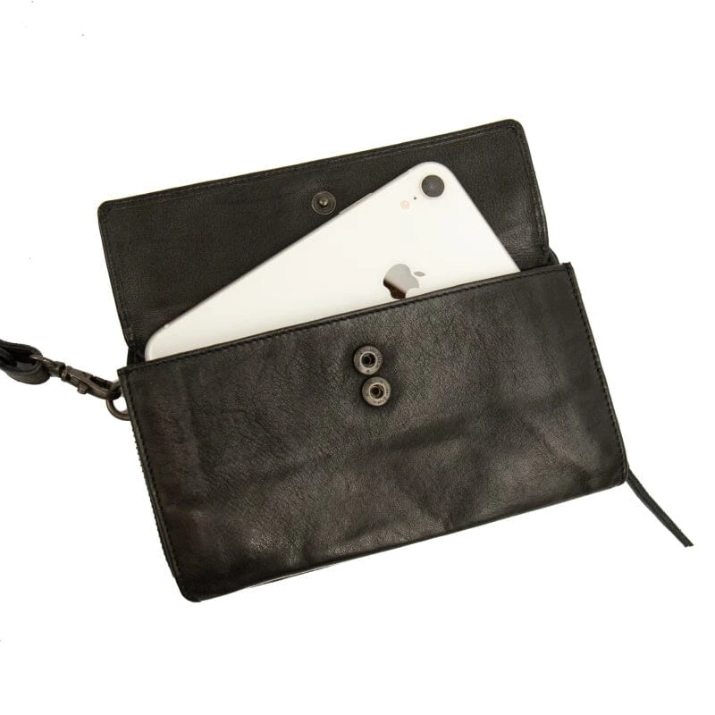 De Lilian Telefoon Tas Portemonnee is eigenlijk een tas en portemonnee in één. Draag hem als clutch met de polsband, of als crossover dankzij de verstelbare en afneembare schouderband. Er is een telefoonzakje aan de voorkant met een klep met magneetsluiting en een handig ritsvak aan de achterkant. Bijna alle mobiele telefoons van de meeste aanbieders passen perfect. Het hoofdvak heeft een ritssluiting, 12 kaartvakjes, 2 papiergeldvakken, 2 insteekvakken en een ritsvak. Aan de achterzijde bevindt zich een breed ritsvak met een souffle waardoor je gemakkelijk bij het kleingeld kunt komen.