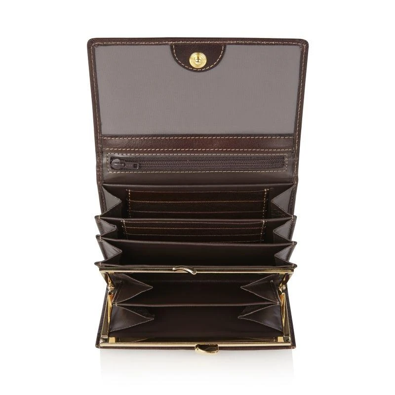 Zeer handzame portemonnee met overslag, beugelsluiting en veel opbergvakken. Bevat 6 creditcardvakjes. Dit  artikel is uitgerust met een high-tech folie, dat het uitlezen van de persoonlijke gegevens via de RFID-chip op uw pasjes volledig blokkeert. Deze damesbeugelportemonnee komt uit de Gaucho-serie van Castelijn & Beerens en is gemaakt van stierenleer behandeld met een transparante verfstof. Afgewerkt met het sierlijke C&B-logo in een leren ovaaltje.Â