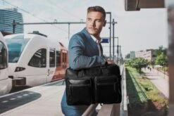 Deze ruime laptoptas voor heren is voorzien van twee hoofdcompartimenten. Het achterste vak is verstevigd en bedoelt om een laptop in op te bergen. De verstevigde zijkanten verminderen de kant op val- en stootschade. Het voorste vak is voorzien van een organizer, smaprtphonevak en extra vak met ritsluiting. Zowel aan de voor- als achterkant zitten extra vakken die je kunt afsluiten met rits. Deze laptoptas wordt geleverd met afneembare – en verstelbare schouderband.