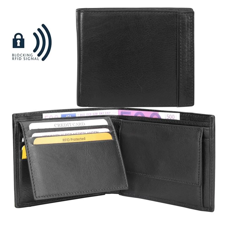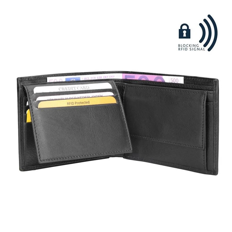 Deze portemonnee is uitgerust met een high-tech folie, dat het uitlezen van de persoonlijke gegevens via de RFID-chip op uw pasjes volledig blokkeert.