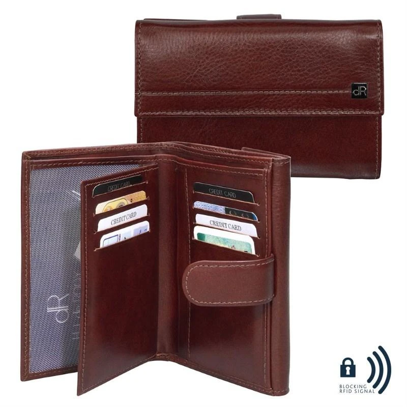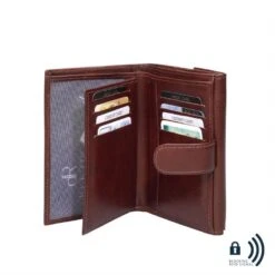 Deze mooie glad lederen portemonnee is zeer functioneel in gebruik. Het bestaat uit twee delen: het vak onder de klep met druksluiting is voor muntgeld. Aan de achterzijde is plaats voor negen betaalpassen, waarvan een vak een kijkvenster heeft. De portemonnee heeft een steekvak voor papiergeld en verder vier vakken voor extra opbergruimte.