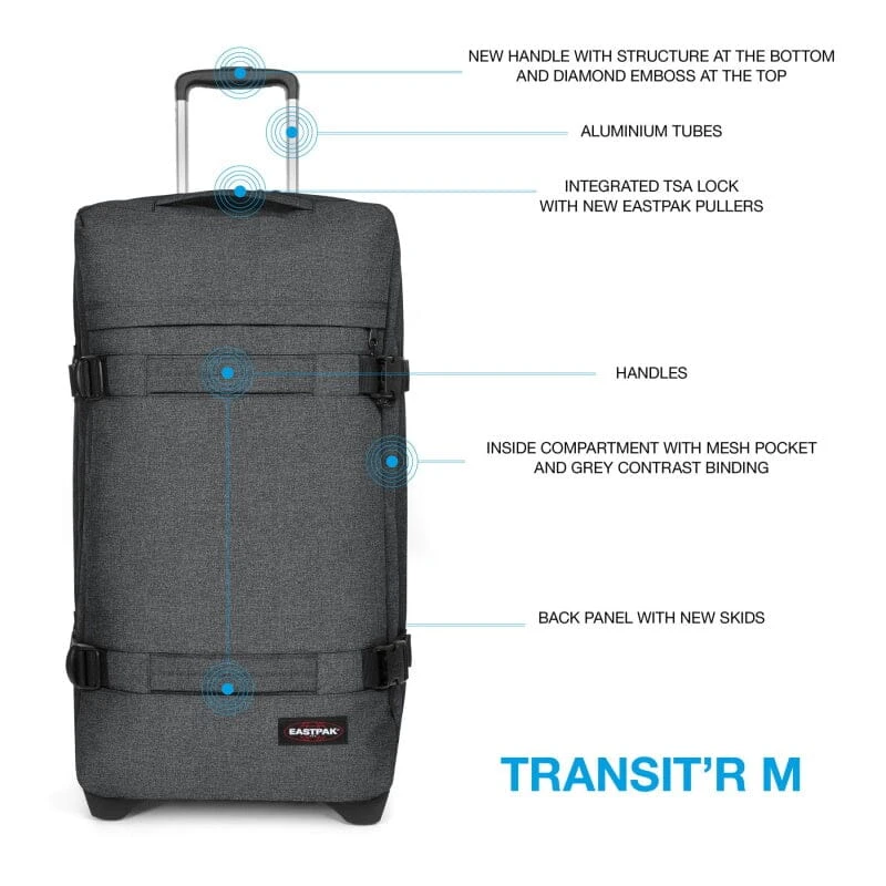 De Eastpak Transit’R M is vernieuwde versie van de Transverz en is een betrouwbare reisgenoot voor ieder type avonturier. Door het compacte formaat en de diverse opbergmogelijkheden is dit model ideaal voor een middellange vakantie. De tas sluit met een ritssluiting en een geïntegreerd driecijferig TSA-slot. Deze wieltas heeft aan de bovenkant een handvat en dubbele draaghengsels aan de bovenzijde. Door de compressiebanden die zijn aangebracht kan het volume van de tas worden aangepast, handig voor als je een keer wat meer/minder meeneemt. De tas heeft een uitschuifbare trekstang en twee wielen, hierdoor rol je zo naar de incheckbalie!Â