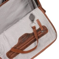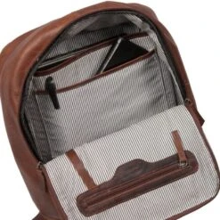 Het ruime hoofdvak is ver te openen, zodat je je spullen eenvoudig kunt in-en uitpakken en is afsluitbaar door middel van een rits. Op de voorzijde zit een compartiment met verborgen rits voor kleine items waar je snel bij kunt komen. In het hoofdvak zitten een ritsvakje en twee insteekvakken mooi afgewerkt met leer. Eén van de vakken is gewatteerd, speciaal voor je laptop/tablet (31×26 cm). De verstelbare schouderriemen en het gevoerde rugpaneel zorgen voor extra draagcomfort. Je kunt de tas ook makkelijk dragen als handtas door de stevige handvatten die een opvallend detail vormen evenals de gestreepte binnenvoering.