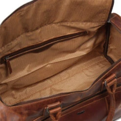 Stoere leren reistas van het merk Justified die is uitgevoerd in hoogwaardig,soepel gelooid kwaliteits leer. Tas heeft een groot hoofdvak dat afsluitbaar is met een U-vormige klep met ritssluiting. In het hoofdvak zit op de binnen achterzijde een klein ritsvak. Tevens zit in het hoofdvak een leren riempje vastgestikt met daaraan een sleutelring en mini zaklampje. Op de voorzijde van de tas zit een groot ritsvak. De tas is in de hand te dragen met de twee handvatten of over de schouder met de afneembare lange, verstelbare schouderband.