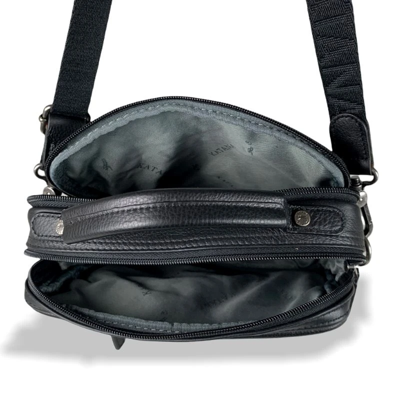 Deze herentas van het merk Katana is een compacte, mulfictionele lederen reportertas met veel vakken die is gemaakt van heel soepel rundleer. De tas heeft een leren boven handvat om de tas aan de hand te dragen maar er wordt ook een leren schouderband meegeleverd om de tas op de schouder te dragen. De leren schouderriem is in lengte verstelbaar waardoor de reportertas ook crossbody gedragen kan worden. De hele tas heeft een binnenvoering van polyester met een lining van Katana.