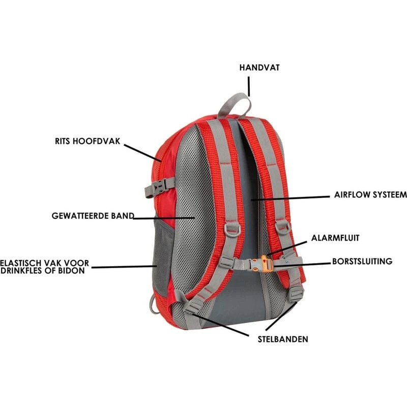 Door de gewatteerde achterkant voelt de tas ook licht aan wanneer je tas vol zit met boeken voor je schooldag of eten en drinken voor een dag mountainbiken. Waar de meeste tassen uit een vlak oppervlakte bestaan, bestaat deze uit twee verstevigde gewatteerde banden waardoor tussen de twee banden een lekker windje loopt en je rug niet hartstikke warm wordt. Door een stevige borstsluiter zit de tas comfortabel. Een handig extraatje aan deze tas is het alarmfluitje dat zit verwerkt in de borstsluiter. Bevind je je in een noodsituatie? Blaas op de fluit en omstanders zullen dit horen.