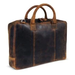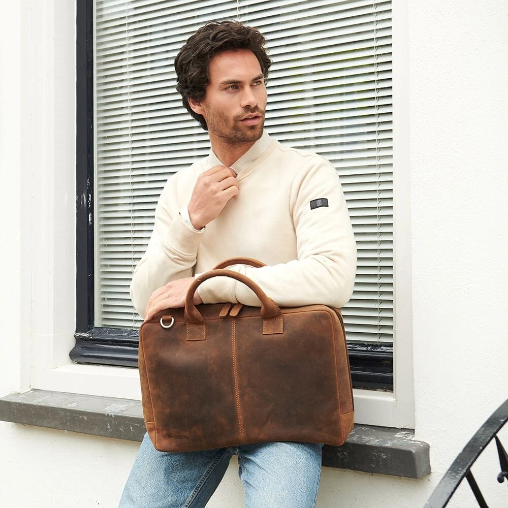 Deze stoere laptoptas is gemaakt van plantaardig gelooid vintage volnerf rundleer en heeft 1 ruim hoofdvak, waarin een gepolsterd gedeelte voor een 17.3 inch laptop zit en twee rekbare vakken voor muis/adapter en bekabeling. Er wordt een schouderband met een comfortabele schouderpad meegeleverd.