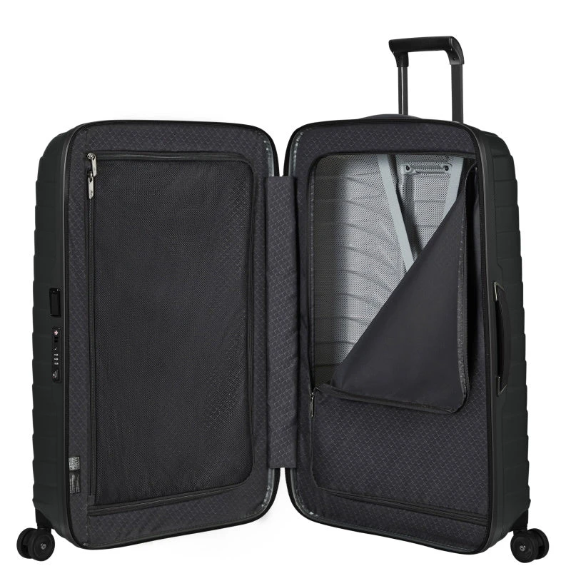 Over het interieur heeft Samsonite ook goed nagedacht. Aan de voorkant bevinden zich namelijk inpakriemen waarmee bagage op de plaats gehouden kan worden. De achterkant is af te sluiten doormiddel van een tussenschot waardoor bagage afgescheiden kan worden. Om bagage optimaal te beveiligen beschikt deze koffer over een verzonken TSA cijferslot, waardoor zorgeloos van en naar de VS gereisd kan worden.