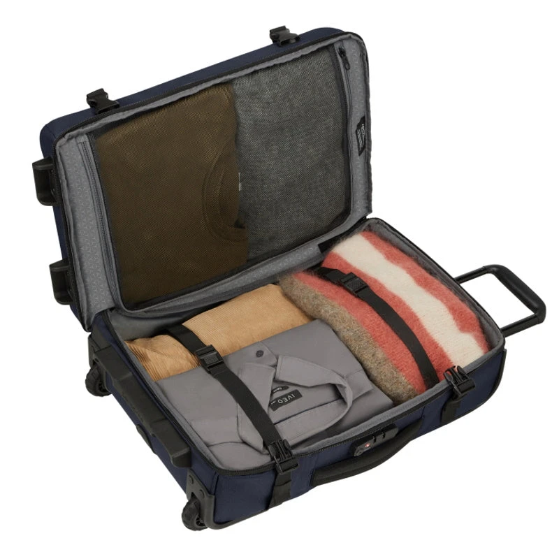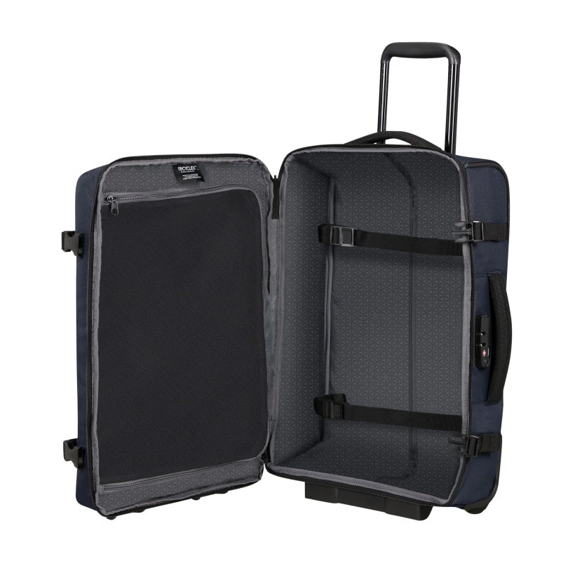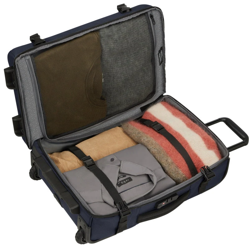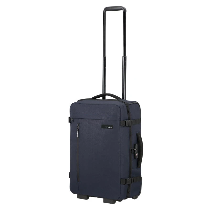 De Roader Wieltas 55 is de kleinste reistas met wielen uit de Roader serie en mag mee als handbagage met de meeste vliegmaatschappijen. De reistas heeft twee soepel lopende wielen, een verstelbare trekstang en twee handvatten waardoor de koffer gemakkelijk overal mee naar toe te nemen is. Aan de binnenzijde van de tas bevinden zich twee compartimenten die worden afgesloten met een rits en ook aan de voorzijde van de tas is een ritsvak te vinden. De spanbanden maken het mogelijk om bagage zo compact mogelijk te maken. Thuis kan de tas worden platgemaakt en zo worden opgeruimd. Dankzij het TSA-slot is de inhoud veilig opgeborgen.Â