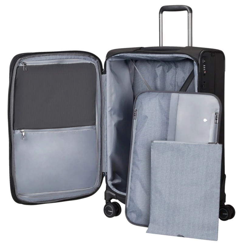Deze trolley heeft een ruime indeling met elastische inpakriemen, een floating divider en 2 extra ritsvakken voor meer opberg gemak. Het voorvak is geschikt voor al je zakelijk spullen met gewatteerd 15.6″ laptop- en apart tablet vak, passend voor A4 materiaal en heeft meerdere opbergvakjes. Met USB aansluiting en ruimte voor het plaatsen van je powerbank. Te vergroten met een rits van 40 naar 47 liter. De spinner heeft een vast TSA slot met kabel waarmee je de voorvakken ook kunt afsluiten. Prettig in gebruik met 2 diepliggende wielen, stevige handgrepen en dubbele, verstelbare trekstang.