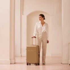 Deze nieuwe reiscollectie brengt je terug naar de jaren 70 met aardse tinten; Basil Green, Coral Cloud, Antique White en Seaport Blue die gecombineerd zijn met messing details en natuurlijke stoffen als, canvas en linnen.Â