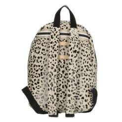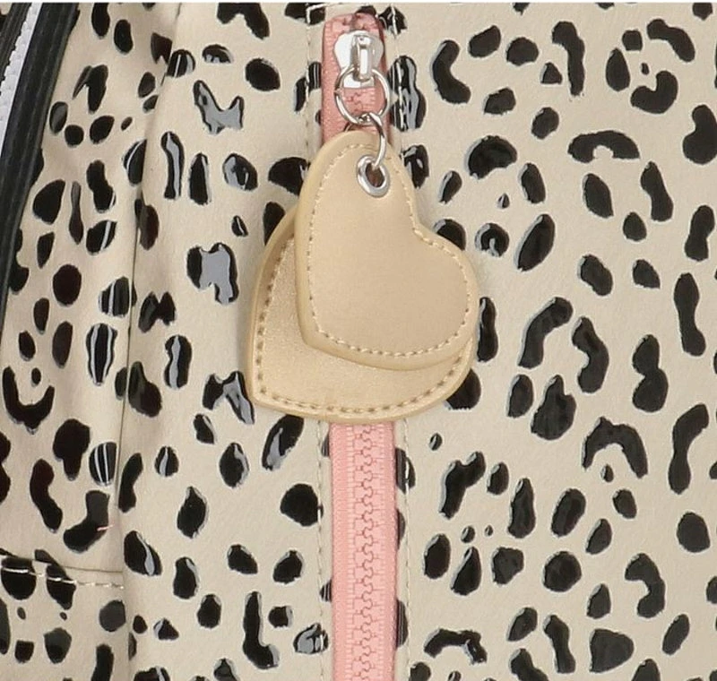 Een PU panter print die ontstaat door zwarte lak spots. Taupe-variant in een middenmaat uitvoering. De rugzak heeft voorop een verticale rits in dezelfde kleur met gouden hartjes en dient als extra opbergvak. De gehele tas sluit met een stevige blokrits met dubbele sluiting. De tas is te dragen dmv verstelbare schouderbanden (in print) en dmv het korte hengsel bovenop. Aan de binnenkant van de rugzak bevinden zich 2 drinkbekervakken en een lichtroze gestreepte voering. Achterop zit het bekende naamlabel.Â