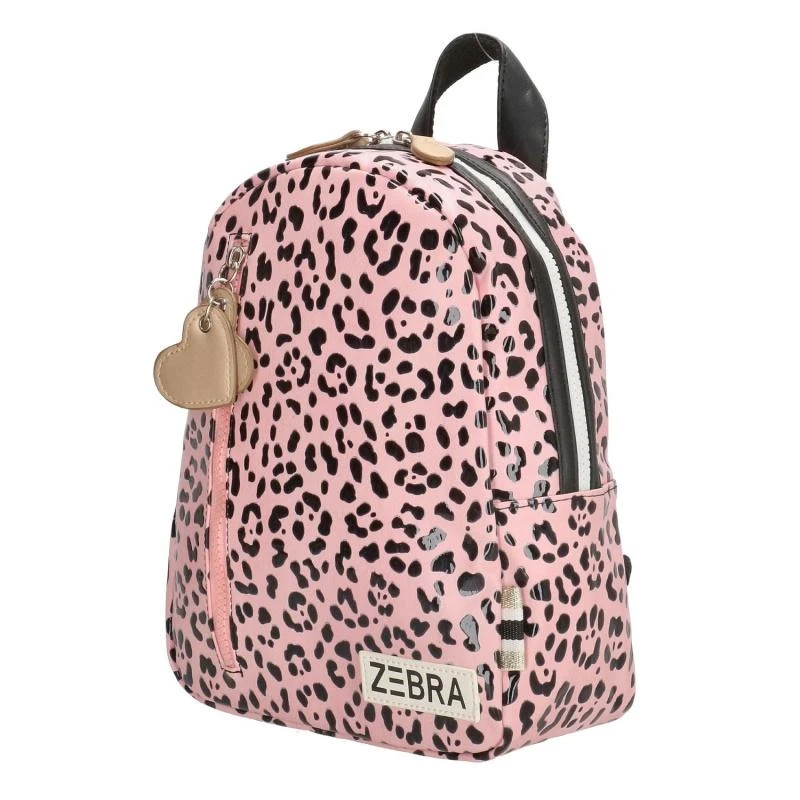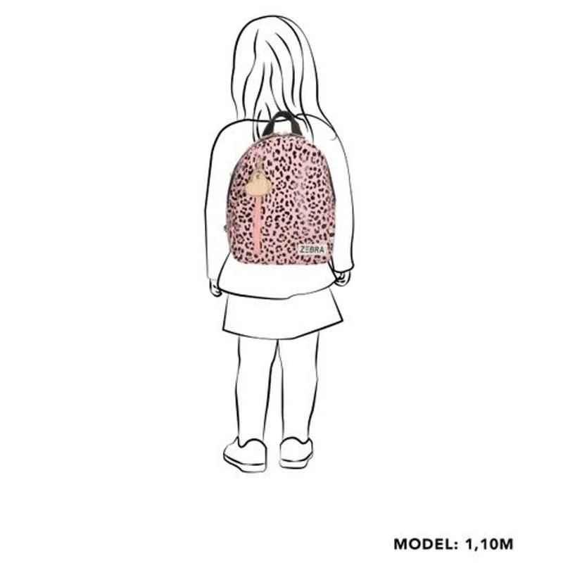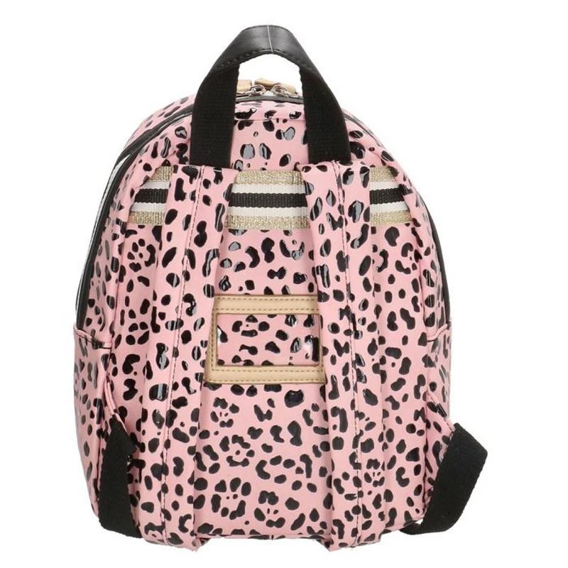 Een PU panter print die ontstaat door zwarte lak spots. Lichtroze variant in klein model. De rugzak heeft voorop een verticale rits in dezelfde kleur met gouden hartjes en dient als extra opbergvak. De gehele tas sluit met een stevige blokrits met dubbele sluiting. De tas is te dragen dmv verstelbare schouderbanden (in print) en dmv het korte hengsel bovenop. Aan de binnenkant van de rugzak bevinden zich 2 drinkbekervakken en een lichtroze gestreepte voering. Achterop zit het bekende naamlabel.Â